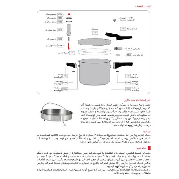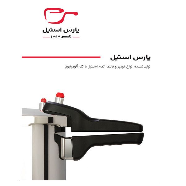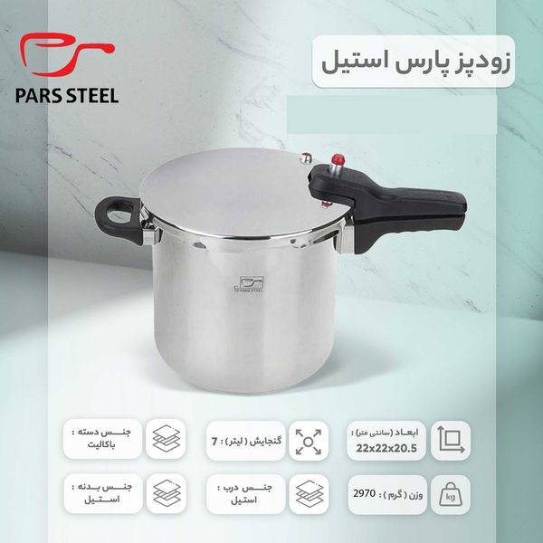 زودپز کمکرسانی عالی برای پخت سریع غذا بهخصوص برای بانوان شاغل است. نچسببودن یکی از ویژگیهای مهم زودپزهاست. دیگ زودپز ششلیتری «پارس استیل» (Pars steele) یکی از نمونههای خوب این نوع محصول است که از استیل ضدزنگ ساخته شده و کفهی آلومینیومی برای جلوگیری از چسبندگی و سوختن غذا دارد. این خاصیت به دلیل پخش یکنواخت حرارت در سطح دیگ، توسط کفی آلومینیومی است. از دیگر ویژگیهای خوب این محصول، ضدخشبودن بدنهی استیل آن است که سبب میشود موادغذایی به بدنهی آن نچسبد و ظاهر آن نیز سالم و براق بماند. یکی از ویژگیهای متمایزکنندهی این زودپز پارس استیل از دیگر نمونهها، وجود سه سیستم تخلیهی فشار است که حداکثر ایمنی را ایجاد کرده و از سوختن غذا هم جلوگیری میکند. این زودپز را برای شستوشو میتوان درون ماشین ظرفشویی نیز قرار داد. شرکت پارس استیل از اولین تولیدکنندههای قابلمه و زودپز داخلی است که سالها با استفاده از تکنولوژیهای روز، محصولاتی باکیفیت عرضه کرده است. این شرکت توانسته با تولیدات عالی، در بازار جهانی به رقابت بپردازد. این تولیدکننده از ابتدا رضایت مشتری و کیفیت را اولویت خود قرار داده و تا به امروز مورداستقبال بوده است.